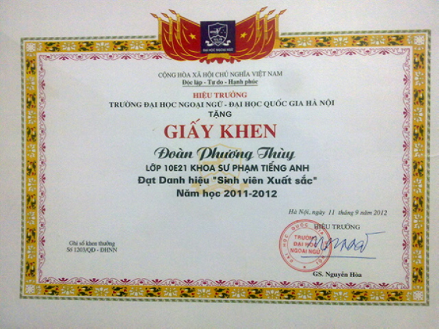 Giấy khen của Đại Học Ngoại Ngữ-ĐHQG Hà Nội