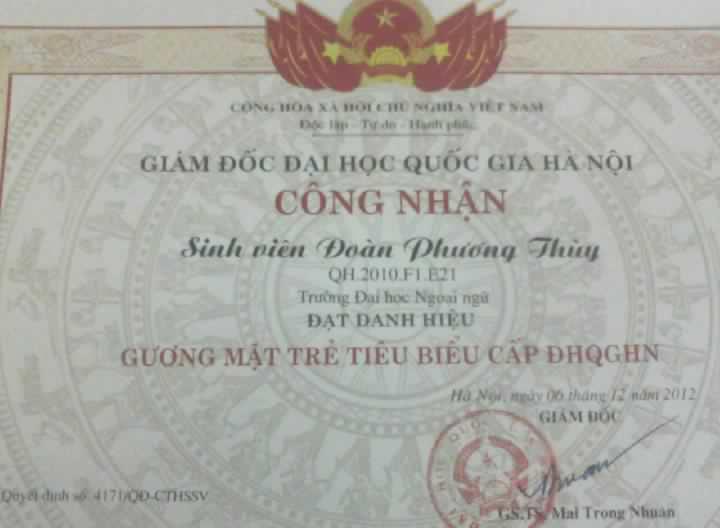 Giấy khen của Đại Học Ngoại Ngữ-ĐHQG Hà Nội